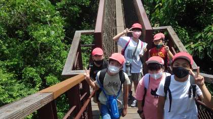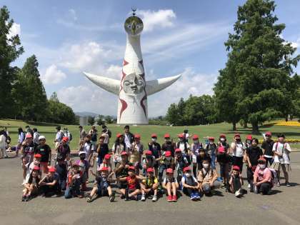 万博公園についてから、ソラード(森の空中観察路)とクイズラリーを班活動で回り、お祭り広場でお弁当を食べました。最後に太陽の塔の前で記念写真を撮りました。