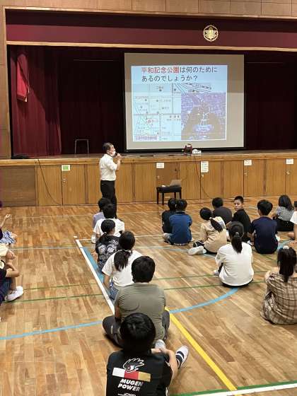 広島平和記念公園内の慰霊碑の話しをしてもらい、原爆の恐ろしさを改めて知りました。修学旅行に向けて、平和について考える、いい機会になりました。