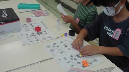 折り紙クラブは、秋の掲示物でモミジやウサギを作りました。