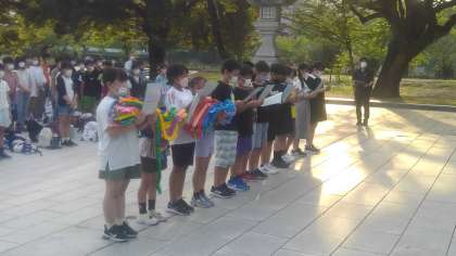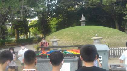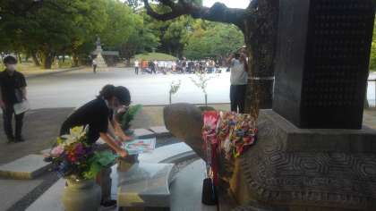 原爆供養塔の前で平和の集いを行いました。平和学習で調べたこと、本日の体験講話や資料館見学で学んだことを胸に、祈りを捧げました。そして、加島小の全校児童とPTAの方に折ってもらった千羽鶴と亀を奉納しました。