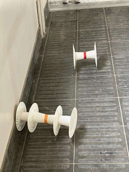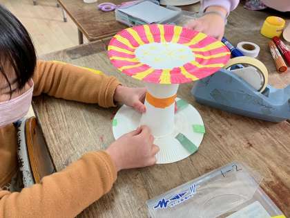 図工科の「かみざらころころ」の学習で紙コップと紙皿を使った転がるおもちゃを作りました。紙皿をタイヤに、紙コップを軸になるように作っていきます。転がる時に車輪の色が変化することに気づき、赤と青を配色し、紫になるように着色するなど工夫をしていました。また、飾りを付けて、コロコロと転がった時に飾りが動く工夫も楽しんでしていました。