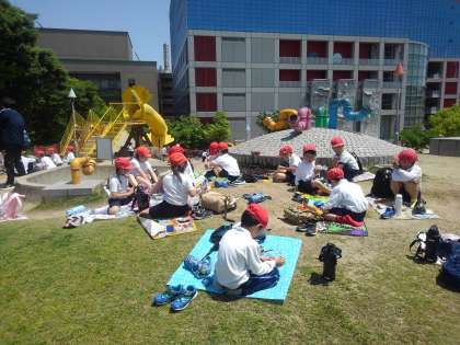 キッズプラザ館内を回った後、扇町公園の芝生でお弁当を食べました。