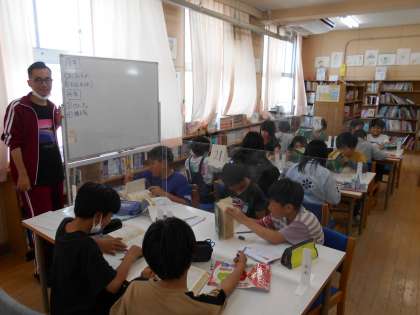 今日は、前回の漢字プリントのほかに「辞書引き学習」を行いました。これは図書室で古くなり使われなくなった国語辞典を有効活用しています。