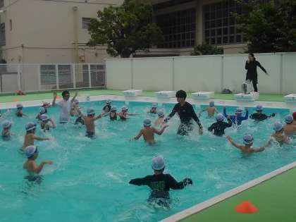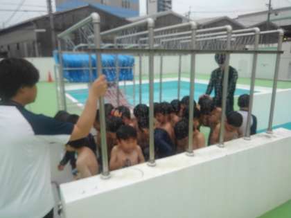 曇りで少し寒い中でしたが、6年生と1年生がプールに入りました。