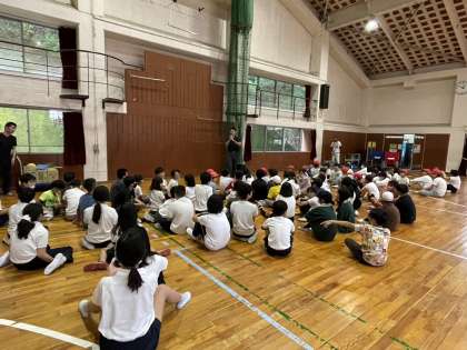 午後からは山登りの予定でしたが、あいにくの雨天模様のため体育館でのスポーツ大会となりました。