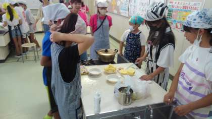 はぐくみネットや保護者ボランティアの方に手伝ってもらいながら、みんなで協力して上手に調理していました。昼食が楽しみです。