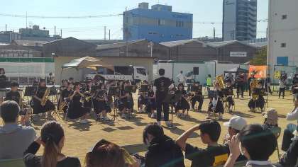 13時からはステージ発表で、美津島中学校の吹奏楽部がオープニングで演奏してくれました。その後は、ダンスや空手などたくさんのパフォーマンスが続き、本当に多くの人が来場してにぎやかなお祭となりました。
