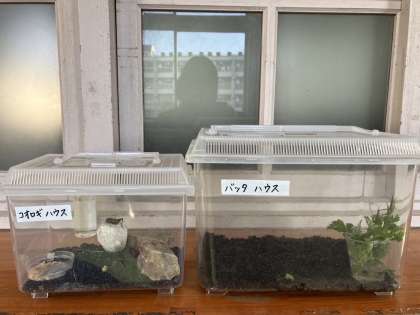 バッタもコオロギ もいました!やさしく上手につかまえて、虫かごのお家を子どもたちがつくってくれました。