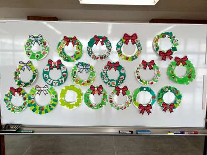 12月19日火曜日の2時間目と3時間目にアイリスのみんなでウインターフェスティバルをしました。2時間目はリースを作り、3時間目はゲームをしました。リース作りではみんな集中し、ひとりひとりの個性がでた素敵な作品が出来上がっていました!