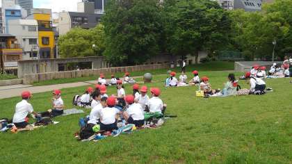 お弁当は、扇町公園の芝生の上で食べました。食べ終わった後は、お菓子タイムや巨大すべり台で、友達とたくさん遊びました。