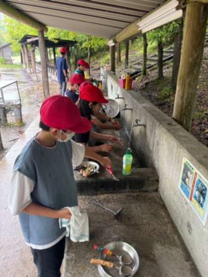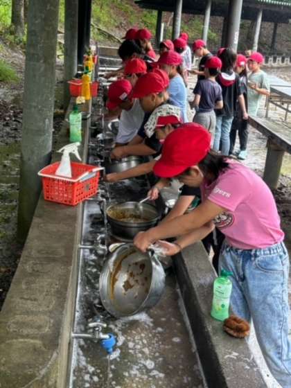 カレーを食べた後は、みんなで後片付けです。お鍋のススがなかなか取れませんが、宿の方のチェックが厳しいので、みんな懸命に磨いています。
