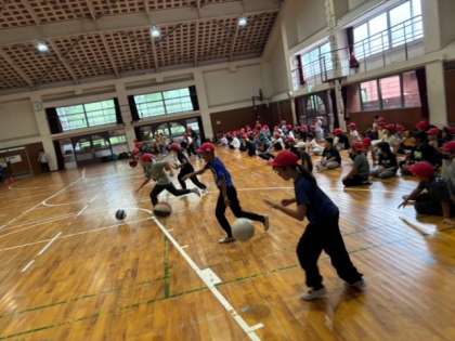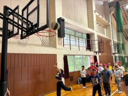 午後から予定していたネイチャークイズが雨天のため屋外でできないので、予定を変更して体育館で室内オリンピックを行いました。ドリブルリレーやフリースロー対決を活動班対抗で行いました。