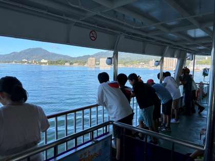 フェリーで宮島へ出発。景色を楽しみながら10分ほどで到着です。