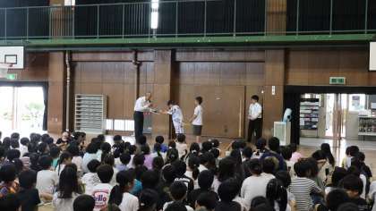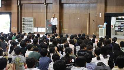 児童朝会では表彰と校長先生から戦争についてのお話がありました。戦争はみんなの大事な宝物が奪われていくことなんだよとお話しされた子どもたちは静かに平和の大切さについて考えを巡らせている様子でした。その他に各教室でも平和について考えるための学習やファミリー班で6年生が修学旅行に持っていく千羽鶴の折り鶴を作る活動も行います。