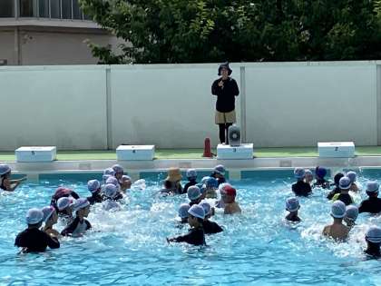 1年のプール学習では、様々な水遊びを中心に顔を水につけることに慣れ、水にもぐる感じ、浮く感じを楽しんでいきます。