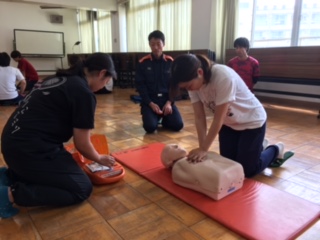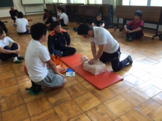 6月は、体育の学習において、水泳の学習がはじまります。事故が発生しないように、万全はつくしています。しかし、万が一という学校危機管理強化のため、全教職員を対象に、救命救急の研修を実施しました。現役の淀川消防暑の消防隊員さん3名を講師に迎え、心肺蘇生等の講義と実技を実践しました。