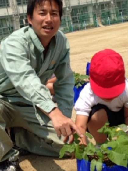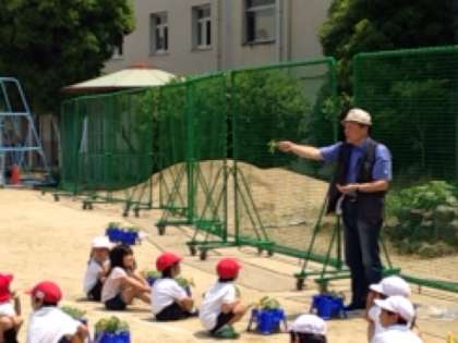 1年生が毎朝お世話をしているアサガオが、すくすくと育ちました。そこで、アサガオの育て方をよくご存じな方に講師になっていただき、元気なアサガオがさらによく育つように植えかえました。