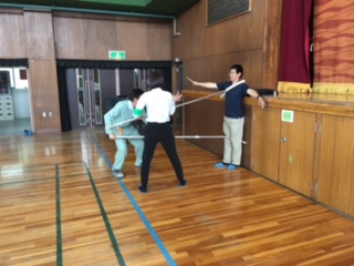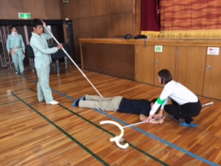 本日、淀川警察の警察官の方を講師に招き、不審者が学校に侵入した想定の訓練を行いました。