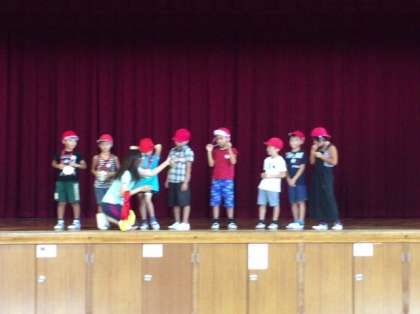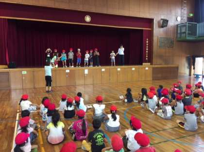 5時間目に講堂で、8月生まれの人たちのお誕生日をお祝いする集会を開きました。バースデーマンが登場し、8月生まれの人たちにインタビューしたり、記念写真を撮ったり、しっぽとり鬼ごっこをしたりしました。講堂狭しと元気いっぱい走り回った1年生は、終了後くたくたになっていました。