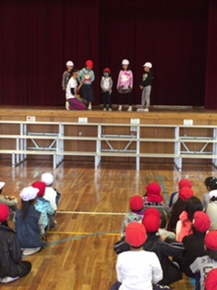 その後、バナナおにごっこをしました。みんな元気いっぱい講堂を走り回って、先生も子どもたちもくたくたになっていました。