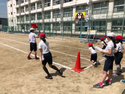 2年生は、5年生と一緒に、体力テストを行いました。ソフトボール投げ、50メートル走、立ち幅跳びの3種目です。優しい5年生のお兄さん、お姉さんのいうことをよく聞いて、一生懸命行いました。