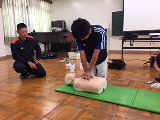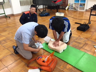 講習会では、DVDの視聴を通しての研修の後、実技研修を行いました。胸部圧迫や人工呼吸、AEDの扱い方等、一連の動きを訓練用の人形を使って、参加した教職員全員が実際に行いました。具体的な助言をいただきながら充実した講習を受けることができました。
