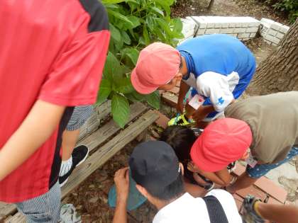 1時間は4グループに分かれて校庭や学習園で生き物探しをしました。調べる前は「生き物、たくさん見つかるのかなあ?」と半信半疑だったのですが、1時間みっちり探してみると、なんと全員で約40種の生き物を見つけることができました。中には、緑色の「謎のたまご」などもあり、子どもたちは大興奮でした。「謎のたまご」から何が生まれるかは、環境局の方が持ち帰って調べてくださることになりました。普段なんとなく見ている小さな虫にもオス・メスを見分けるポイントがあったり、ハチも毒針を持たない種類がいたりと、教科書では知ることができないことも教えて頂きました。