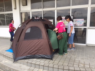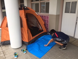 テントを組み立てました。グラウンドのコンディションが悪いため、渡り廊下にテントを設営しました。今夜を過ごすために、夕食の食材の買い出しチームとテント設営チームに別れ、協力して作業に取りかかっていました。