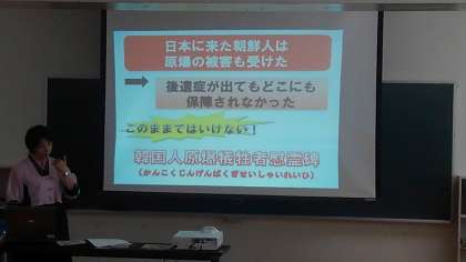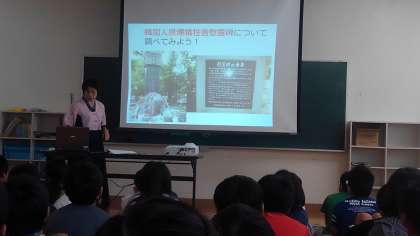 まず、戦争に至る流れや、在日韓国人、朝鮮人が多くいる理由などを教えていただきました。そして、広島の原爆で亡くなった5人に1人は韓国人だったことや、韓国人慰霊碑についての経緯など、教科書では分からない歴史について、ご自身の経験談をも交えながら授業していただきました。平和について深く考えさせられる1時間となりました。