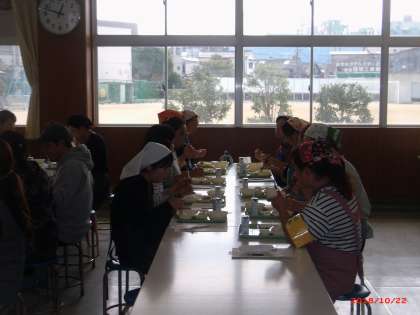 栄養教諭江見先生のお話のあと、今日の給食メニュー、鶏肉のごまだれ焼き・ソーキ汁・もやしの生姜醤油あえを食べていただきました。