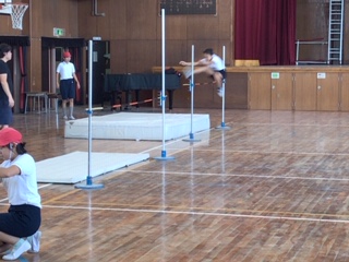 走り高跳びをしました。どうしたらバーを飛び越えられるのか、ポイントを考えながら跳びました。友達がうまく跳び越せたときには自然と拍手が起こりました。アドバイスや励まし合いができています。