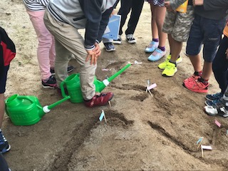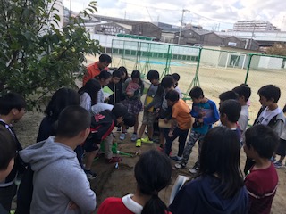 土山に川をつくって水を流してみました。蛇行する川の水はどのように流れるのか、雨(水)の量が増えるとどうなるのか、実際に実験してみるとわかることがあります。みんな集中して観察していました。