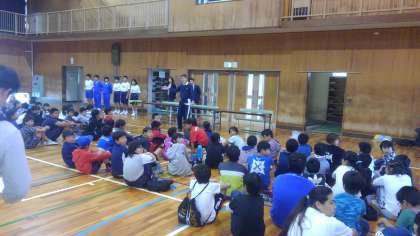 加島小と三津屋小の5・6年が参加し、両校混合チームで、男子が6チーム、女子が3チーム、それぞれリーグ戦をしました。美津島中生徒会のメンバーが準備と審判をしてくれました。
