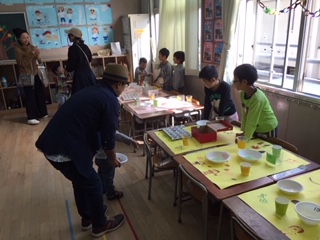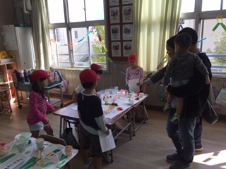1年生は秋の自然を使って、どの学級も「木の実まとあて」のお店を出していました。