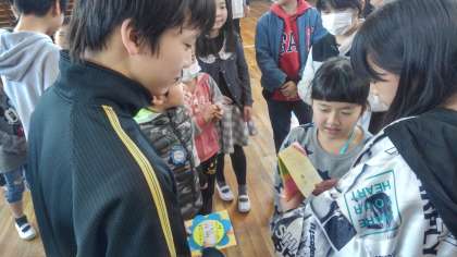 5年生の代表委員の子を中心に、呼びかけや6年生クイズなどで6年生への感謝の気持ちを伝えました。また、ファミリー班ごとに作成したメダルを1年生から6年生へと手渡す場面もありました。
