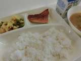 5月13日(金)の給食は「あかうおのしょうゆだれかけ、みそ汁、えんどうの卵とじ、...