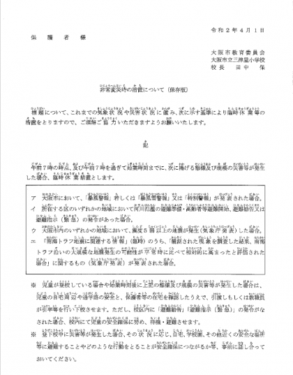 年度当初にお配りした、「非常変災時の処置について」を改めて、お知らせいたします。