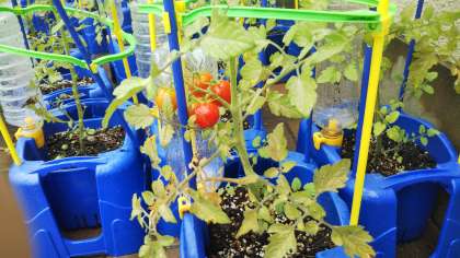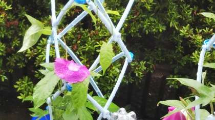 校庭では、1年生が育てたあさがおがたくさん咲いています。2年生が育てたミニトマトはたくさん実っています。毎日水やりを頑張った成果ですね。