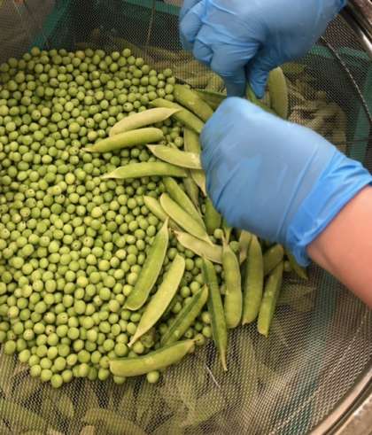 今日は、給食室でさやから取りだした生のえんどうを使用しています。