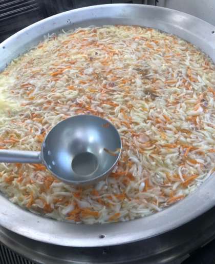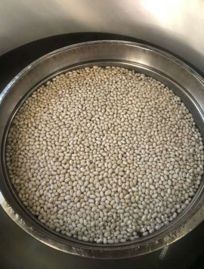 写真は、てぼ豆のスープの調理の様子です。熱湯で豆をもどし、調理しています。