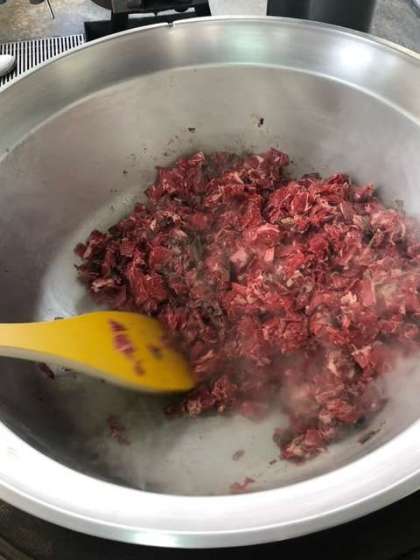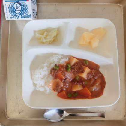 写真は、ハヤシライスの調理の様子です。給食では、ルウから手作りしています。