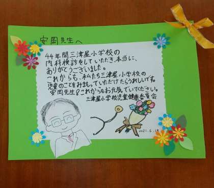 安岡先生は、44年間三津屋小学校の校医として、子どもたちの健康診断をおこない、また我々学校への指導、助言をいただいてまいりました。