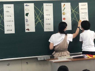 給食に使われている様々な食材の絵と名前を一致させるゲームをしたり、食材をその主な働きによって三つのグループに分けたりする活動をしました。
