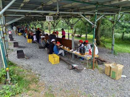 協力して作ったカレーはとてもおいしいです。どの班もおかわりしています。