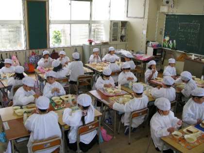 1年生は初めての給食です。今は6年生のお兄さん・お姉さんが重い食器などを運ぶのを手伝ってくれています。配膳は少しずつ自分たちでやっています。