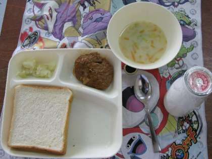 今日のメニューは「煮込みハンバーグ・豆乳コーンスープ・焼きじゃが」です。みんなでおいしくいただきました。