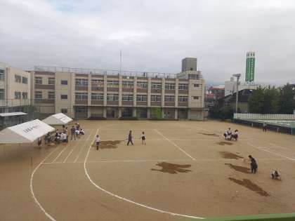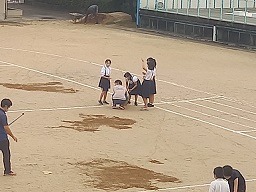昨日からの雨の影響で運動場がかなり水たまりができていましたが、早朝より教職員で水を吸い取り、登校してきた子どもたちも手伝って、運動場の整備を行っています。少しでも運動場で練習ができるようにと、みんなで協力しています。