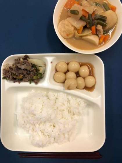 給食には、「一口がんもとさといものみそ煮」にさといもが、「みたらしだんご」にだんごが使われています。