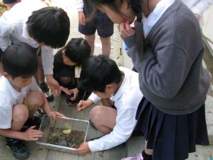 運動場のすみっこで3年生が熱心に地面を見ています。ダンゴ虫を探しています。土を掘ってカナブンの幼虫を見つけた人もいました。虫のおもしろさを十分に感じてほしいと思います。