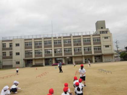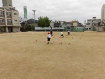 ハードルとコーンを置いて、いろいろな運動をしています。元気よく、活動をしています。